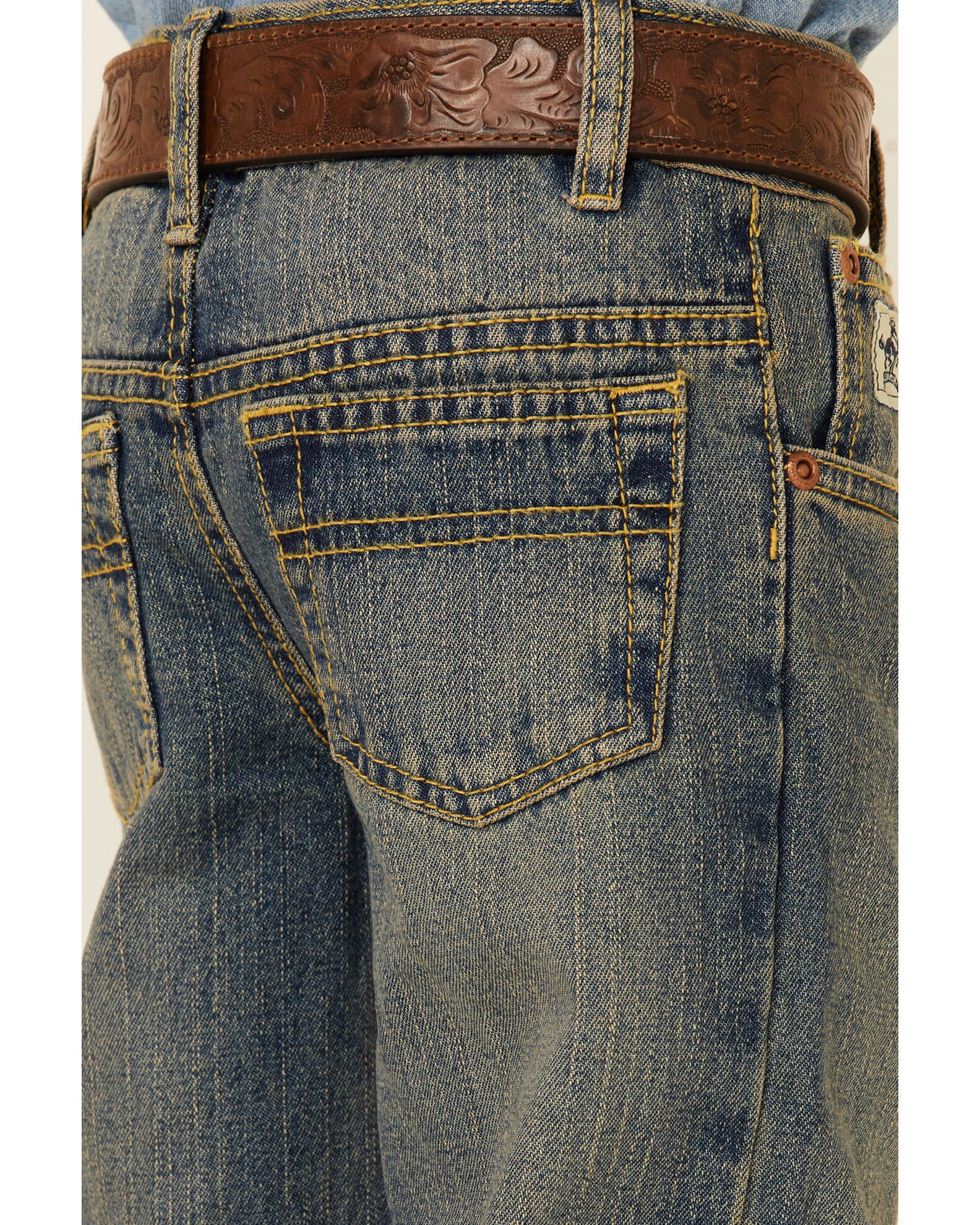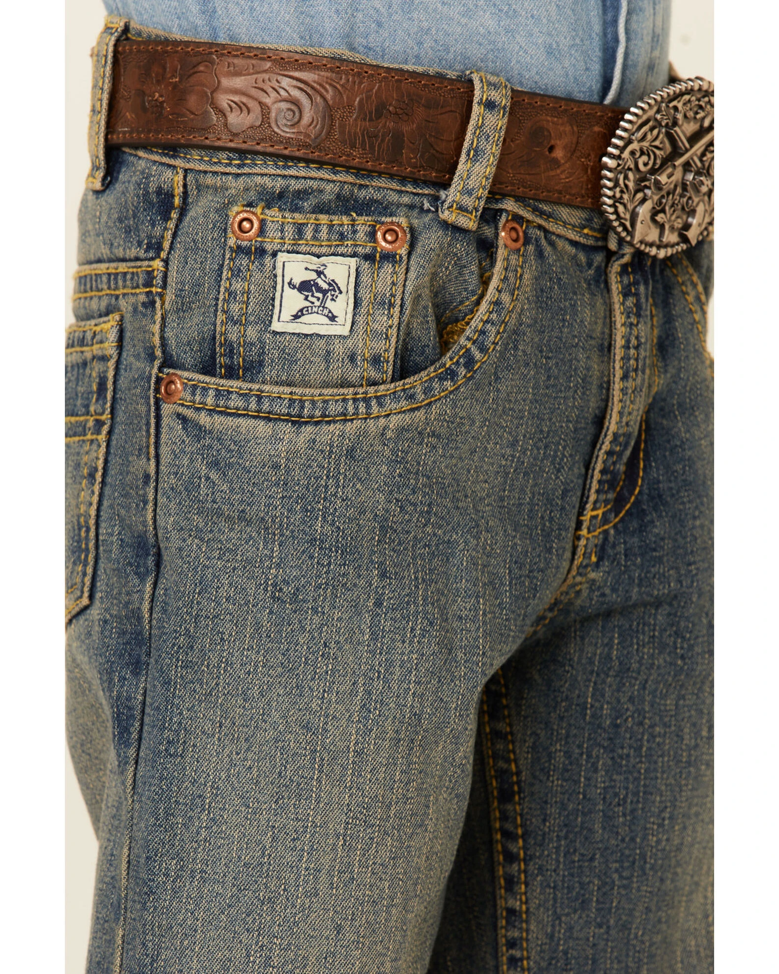 The perfect jeans for growing boys to explore the world in. These Cinch Low Rise Slim Fit Jeans are for rough and tumble cowboys. Featuring a cool khaki tint finish and medium wash, these jeans are made for boys who like to get outside.