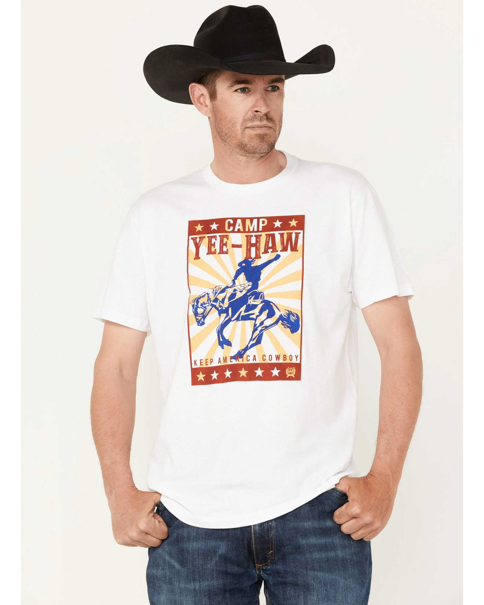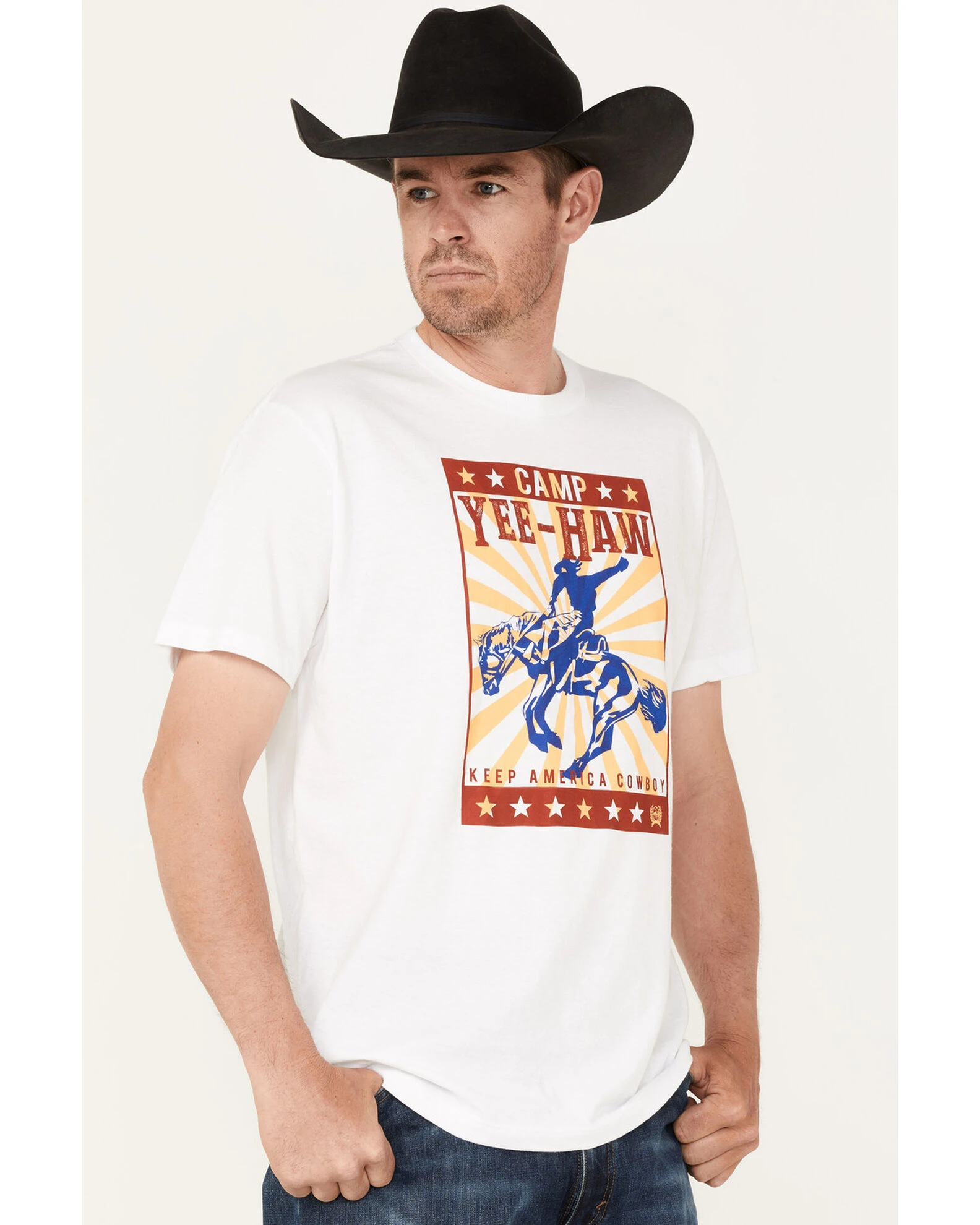 - “Camp Yee-Haw Keep America Cowboy” with rodeo poster graphic on front