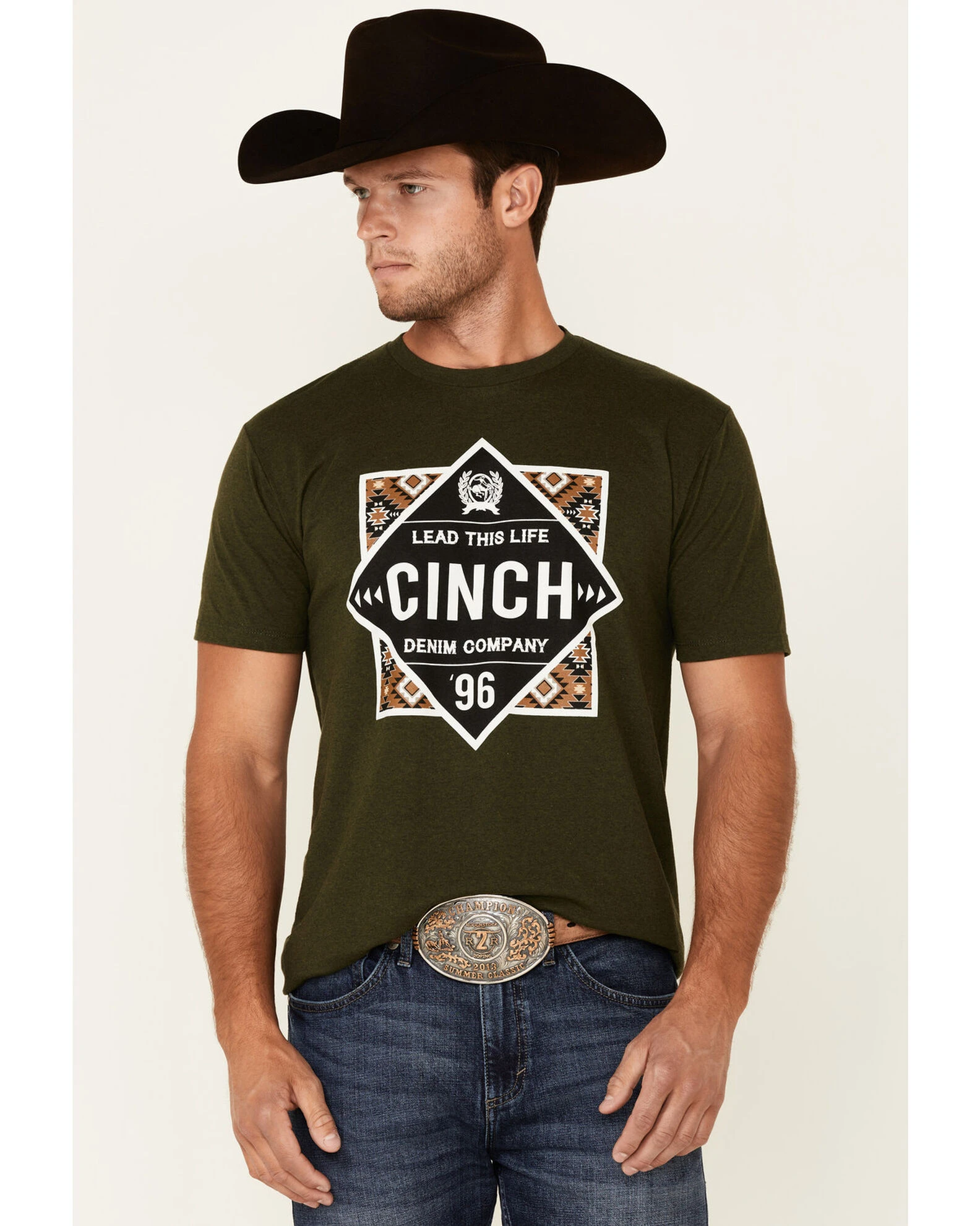 - “Cinch Denim Lead This Life” Southwestern logo graphic on front