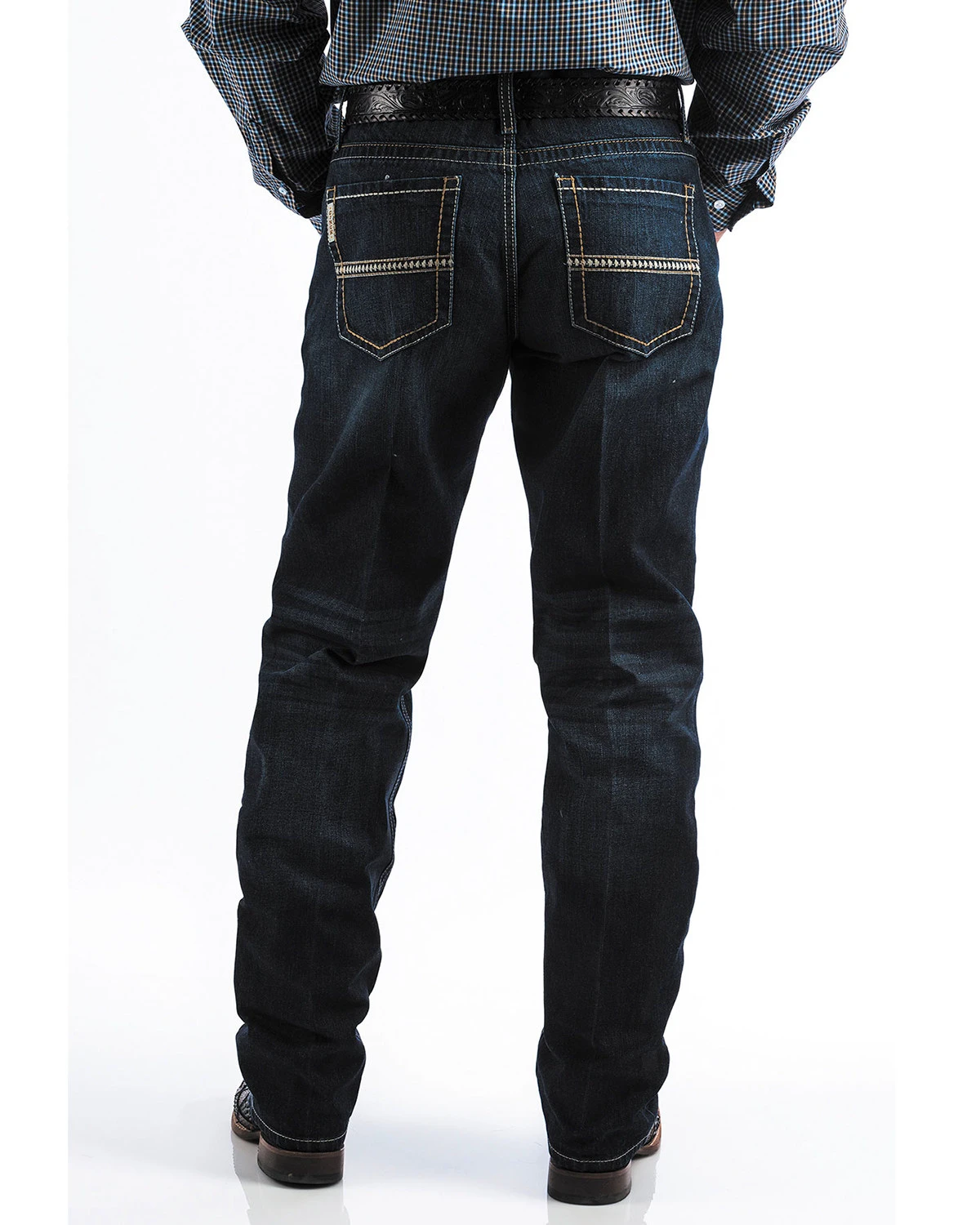 Get the classic cowboy look in these Cinch jeans! Made with comfort in mind they feature extra room for your thigh and hips. The loose boot cut jeans have dual stitching, hand sanding, whiskers, and decorative back pockets. Pair with a tee and boots!
